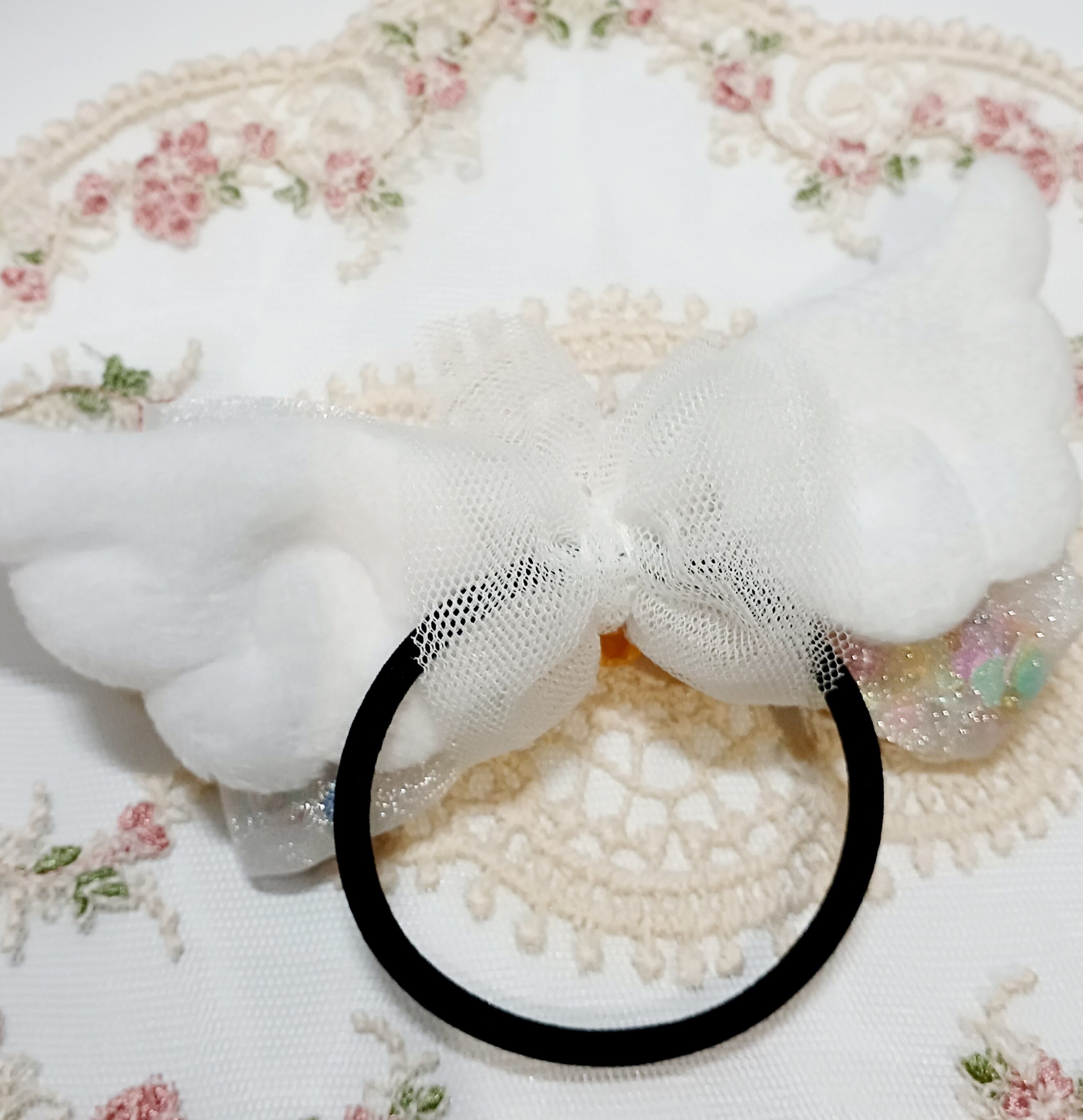 小さなパーツがリボン部分に沢山入った大ぶりのヘアゴムリボンです。